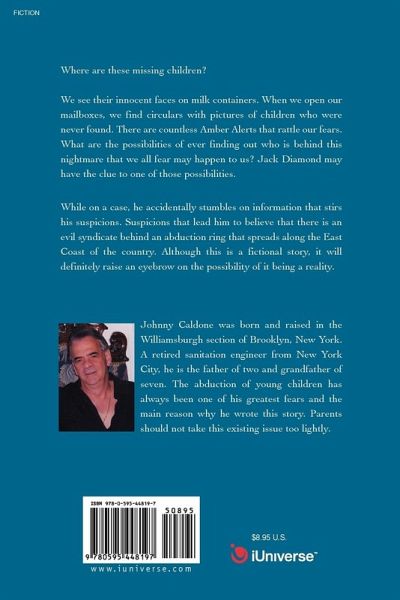 Where are these missing children? We see their innocent faces on milk containers. When we open our mailboxes, we find circulars with pictures of children who were never found. There are countless Amber Alerts that rattle our fears. What are the possibilities of ever finding out who is behind this nightmare that we all fear may happen to us? Jack Diamond may have the clue to one of those possibilities. While on a case, he accidentally stumbles on information that stirs his suspicions. Suspicions that lead him to believe that there is an evil syndicate behind an abduction ring that spreads along the East Coast of the country. Although this is a fictional story, it will definitely raise an eyebrow on the possibility of it being a reality.
