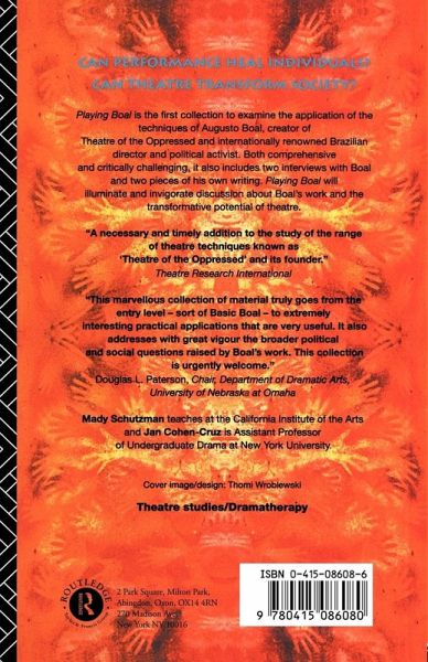 Playing Boal examines the techniques in application of Augusto Boal, creator of Theatre of the Oppressed, Brazilian theatre maker and political activist. This text looks at the use of the Theatre of the Oppressed exercises by a variety of practitioners and scholars working in Europe, North America and Canada. It explores the possibilities of these tools for "active learning and personal empowerment; co-operative education and healing; participatory theatre and community action." This collection is designed to illuminate and invigorate discussion about Augusto Boal's work and the transformative potential of theatre. It includes two interviews with Boal, and two pieces of his own writing.
