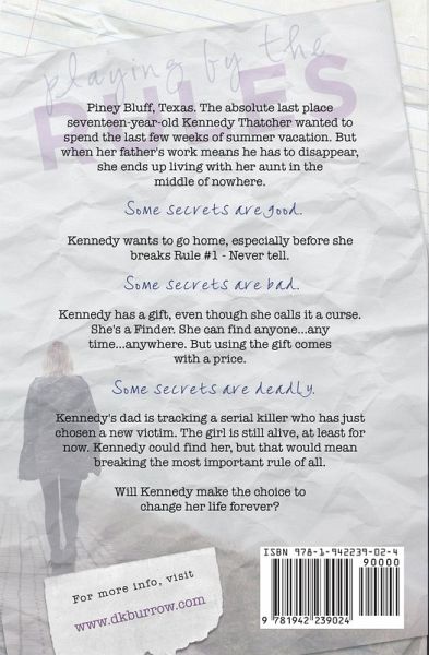 Piney Bluff, Texas. The absolute last place seventeen-year-old Kennedy Thatcher wanted to spend the last few weeks of summer vacation. But when her father's work means he has to disappear, she ends up living with her aunt in the middle of nowhere. Some secrets are good. Kennedy wants to go home, especially before she breaks Rule #1 - Never tell. Some secrets are bad. Kennedy has a gift, even though she calls it a curse. She's a Finder. She can find anyone…any time…anywhere. But using the gift comes with a price. Some secrets are deadly. Kennedy's dad is tracking a serial killer who has just chosen a new victim. The girl is still alive, at least for now. Kennedy could find her, but that would mean breaking the most important rule of all. Will Kennedy make the choice to change her life forever?