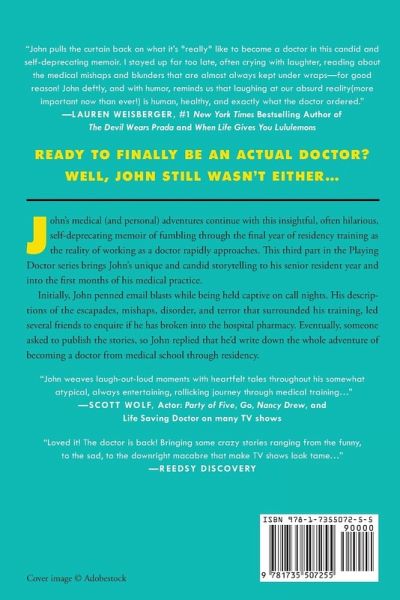 READY TO FINALLY BE A DOCTOR? WELL, JOHN STILL WASN'T EITHER... John's medical (and personal) adventures continue with this insightful, often hilarious, self-deprecating memoir of fumbling through the final year of residency training as the reality of working as a doctor rapidly approaches. This third part in the Playing Doctor series brings John's unique and candid storytelling to his year as senior resident and into the first months of his medical practice. Initially, John penned email blasts while being held captive on call nights. His descriptions of the escapades, mishaps, disorder, and terror that surrounded his training, led several friends to enquire if he has broken into the hospital pharmacy. Eventually, someone asked to publish the stories, so John replied that he'd write down the whole adventure of becoming a doctor from medical school through residency.
