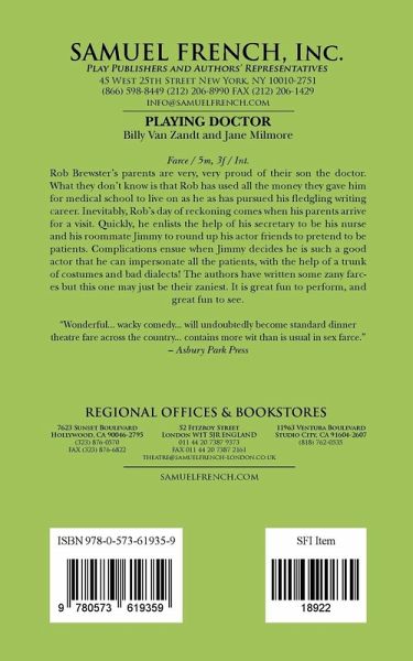Farce / 5m, 3f / Int. Rob Brewster's parents are very, very proud of their son the doctor. What they don't know is that Rob has used all the money they gave him for medical school to live on as he as has pursued his fledgling writing career. Inevitably, Rob's day of reckoning comes when his parents arrive for a visit. Quickly, he enlists the help of his secretary to be his nurse and his roommate Jimmy to round up his actor friends to pretend to be patients. Complications ensue when Jimmy decid