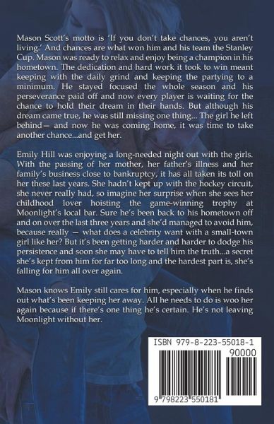 He's the hottest hockey player on the west coast, and his team's just won the Stanley Cup - now he's going after the real prize, winning back the girl he left behind. Mason Scott's motto is, 'if you don't take chances, you aren't living.' After his team's big win, Mason had more on his mind than relaxing and enjoying some downtime. He was going back to his hometown of Moonlight Valley, Washington to make Emily Hill his. Lots of dedication and hard work, along with keeping the partying to a minimum had paid off once, and applying that same tenacity he reserved for the game to winning back his feisty sexy blonde friend from childhood was next on his agenda. His plan was to make her love him all over again and Mason would accept nothing less than to win her heart. Tragedy has struck Emily Hill's family. With the passing of her mother, her father's illness, and their business close to bankruptcy, the last three years have been nothing less than challenging. For a rare girls-night-out, Emily can't believe her eyes when she sees her ex-lover hoisting the game-winning trophy at the crowded local bar. She'd known Mason since she was a young girl but once he became a sports star he left her and the rest of the town without a second thought. Sure he's been back from time to time, but fortunately she's been able to avoid him during his visits. But now she's feeling guilty about their past, and she may have to come clean and tell him the truth...a secret she's kept from him for far too long. The hardest part - she's afraid she'll fall for him all over again.