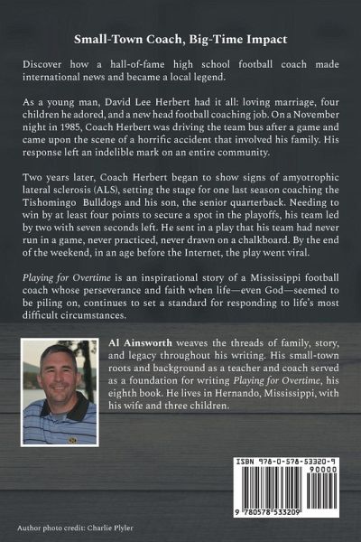 He was handed a terminal diagnosis. The way he faced it would make him immortal… Tishomingo County, Mississippi, 1985. David Lee Herbert was passionate about coaching high-school football. But one night driving the team bus home from a game, he came upon an accident that had claimed the life of his daughter. Two years later, the devoted Christian was diagnosed with ALS. Despite his personal death sentence, Coach Dave and his wife clung to faith and persevered when others might've thrown in the towel. And he achieved legendary status in his final season, famously calling an improvised play with seven seconds left that delivered a miraculous playoffs berth. In Playing for Overtime, author and sportscaster Al Ainsworth documents the remarkable dedication of an ordinary man overcoming extraordinary odds. Showing much more of the coach than his well-publicized gameplay, Ainsworth reveals an inspirational account of the incredible impact a single person can have. Be moved to tears and laughter in this tender and profound run to the end zone. Playing for Overtime: The David Lee Herbert Story is a captivating sports biography. If you like real-life challenges, heroic achievements, and moving stories, then you'll love Al Ainsworth's tale of football, family, and faith. Buy Playing for Overtime: The David Lee Herbert Story to find the inspiration you need to face your own personal struggles today.