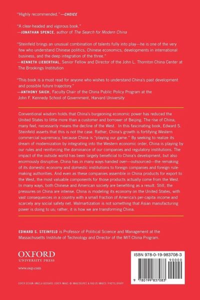 Conventional wisdom holds that China's burgeoning economic power has reduced the United States to little more than a customer of Beijing. Not so, writes Edward Steinfeld. In this fascinating book, Steinfeld asserts that China's growth actually enhances American commercial supremacy. By seeking to realize its dream of modernization by integrating itself into the Western economic order, China is playing by our rules, reinforcing the dominance of our companies and regulatory institutions. Indeed, China has in many ways handed over-outsourced-the remaking of its domestic economy and domestic institutions to foreign companies and foreign rule-making authorities. And even as Chinese companies assemble products for export to the West, the most valuable components for those products come from the West. America's share of global manufacturing, by value, has actually increased since 1990. Within China, the R&D centers established by Western companies attract the country's best scientists and engineers, and harness that talent to global, rather than indigenous Chinese, innovation efforts. In short, China's economic emergence is good for America.