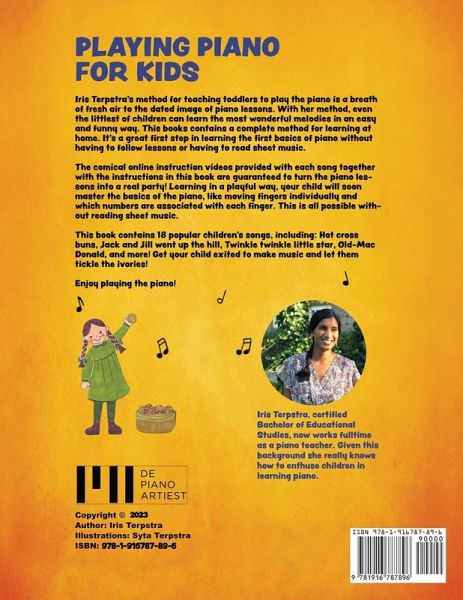 Iris Terpstra's method for teaching toddlers to play the piano is a breadth of fresh air to the dated image of piano lessons. With her methods, even the littlest of children can learn the most wonderful melodies in an easy and funny way. This book contains a complete method for learning at home. It's a great first step in learning the basics of piano without having to follow lessons or having to read sheet music.