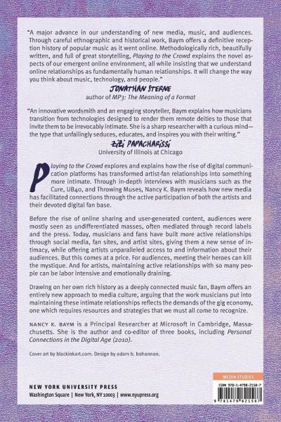 Explains what happened to music-for both artists and fans-when music went online. Playing to the Crowd explores and explains how the rise of digital communication platforms has transformed artist-fan relationships into something closer to friendship or family. Through in-depth interviews with musicians such as Billy Bragg and Richie Hawtin, as well as members of the Cure, UB40, and Throwing Muses, Baym reveals how new media has facilitated these connections through the active, and often required, participation of the artists and their devoted, digital fan base. Before the rise of social sharing and user-generated content, fans were mostly seen as an undifferentiated and unidentifiable mass, often mediated through record labels and the press. However, in today's networked era, musicians and fans have built more active relationships through social media, fan sites, and artist sites, giving fans a new sense of intimacy and offering artists unparalleled information about their audiences. However, this comes at a price. For audiences, meeting their heroes can kill the mystique. And for artists, maintaining active relationships with so many people can be both personally and financially draining, as well as extremely labor intensive. Drawing on her own rich history as an active and deeply connected music fan, Baym offers an entirely new approach to media culture, arguing that the work musicians put in to create and maintain these intimate relationships reflect the demands of the gig economy, one which requires resources and strategies that we must all come to recognize and appreciate.