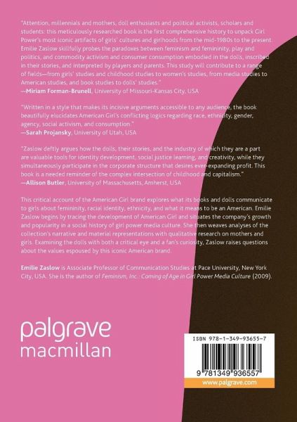 1. Introduction: Unpacking America's Dolls.- 2. Branding American Girl: The Making of Cultural Icons.- 3. Situating American Girl: Books and Dolls as Tools of Socialization in a Changing Culture.- 4. "Baby Doll, You Made the World a Little Bit Better by Speaking Out for What You Believe In": Narratives of Femininity and Political Action in the American Girl Collection.- 5. From "This Where Freedom Supposed to Be At" to "She Knew She Would Never Stop Speaking Out for What Was Right": Racial Logic and African American Identity in American Girl.- 6. "This is my home": Representing Race, Ethnicity, and the American Experience in American Girl.- 7. Conclusion: Constructing America's Girlhood.