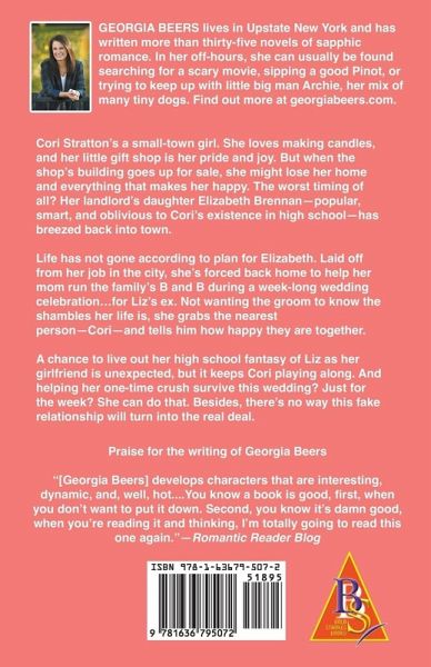 Cori Stratton's a small-town girl. She loves making candles, and her little gift shop is her pride and joy. But when the shop's building goes up for sale, she might lose her home and everything that makes her happy. The worst timing of all? Her landlord's daughter Elizabeth Brennan--popular, smart, and oblivious to Cori's existence in high school--has breezed back into town. Life has not gone according to plan for Elizabeth. Laid off from her job in the city, she's forced back home to help her mom run the family's B and B during a week-long wedding celebration...for Liz's ex. Not wanting the groom to know the shambles her life is, she grabs the nearest person--Cori and tells him how happy they are together. A chance to live out her high school fantasy of Liz as her girlfriend is unexpected, but it keeps Cori playing along. And helping her one-time crush survive this wedding? Just for the week? She can do that. Besides, there's no way this fake relationship will turn into the real deal.