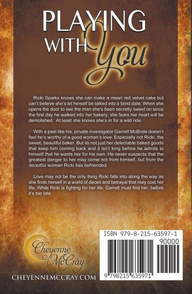 Ricki Sparks knows she can make a mean red velvet cake but can't believe she's let herself be talked into a blind date. When she opens the door to see the man she's been secretly sweet on since the first day he walked into her bakery, she fears her heart will be demolished. With a past like his, private investigator Garrett McBride doesn't feel he's worthy of a good woman's love. Especially not Ricki, the sweet, beautiful baker. But it isn't long before he admits to himself that he wants her for his own. He never suspects that the greatest danger to her may come not from himself, but from the deceitful woman Ricki has befriended. Love may not be the only thing Ricki falls into along the way as she finds herself in a world of deceit and betrayal that may cost her life. Garrett must find her, before it's too late.