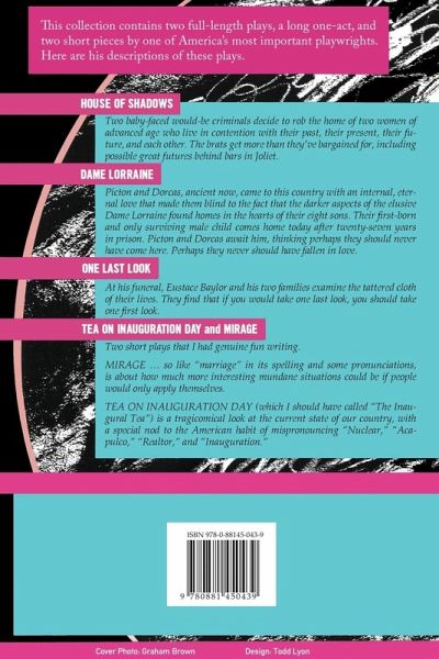 This collection includes two full-length plays, DAME LORRAINE and HOUSE OF SHADOWS, a long one-act, ONE LAST LOOK, and two short pieces, MIRAGE and TEA ON INAUGURATION DAY. DAME LORRAINE: Picton and Dorcas, ancient now, came to this country with an internal, eternal love that made them blind to the fact that the darker aspects of the elusive Dame Lorraine found homes in the hearts of their eight sons. Their first-born and only surviving male child comes home today after twenty-seven years in prison. Picton and Dorcas await him, thinking perhaps they should never have come here. Perhaps they never should have fallen in love. HOUSE OF SHADOWS: Two baby-faced would-be criminals decide to rob the home of two women of advanced age who live in contention with their past, their present, their future, and each other. The brats get more than they’ve bargained for, including possible great futures behind bars in Joliet. ONE LAST LOOK: At his funeral, Eustace Baylor and his two families examine the tattered cloth of their lives. They find that if you would take one last look, you should take one first look. MIRAGE: "Mirage," so like "marriage" in its spelling and some pronunciations, is about how much more interesting mundane situations could be if people would only apply themselves. TEA ON INAUGURATION DAY: A tragicomical look at the current state of our country, with a special nod to the American habit of mispronouncing "Nuclear," "Acapulco," "Realtor," and "Inauguration."