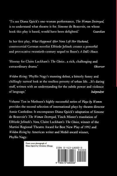 Volume Ten in Methuen's highly successful series of Plays by Women provides the second selection of international plays by theatre director Annie Castledine. It encompasses Diana Quick's adaptation of Simone de Beauvoir's The Woman Destroyed, Tinch Minter's translation of Elfriede Jelinek's Nora , Claire Luckham's The Choice, winner of the Martini Regional Theatre Award for Best New Play of 1992 and Weldon Rising by American writer and Mobil-award winner, Phyllis Nagy.