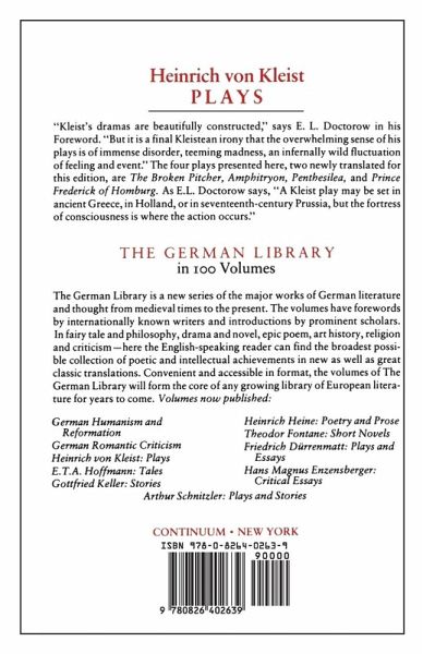The four plays presented here, two newly translated for this edition, are The Broken Pitcher, Amphitryon, Penthesilea, and Prince Frederick of Homburg. As E.L. Docotorow says, 'a Kleist play may be set in ancient Greece, in Holland, or in seventeenth century Prussia, but the fortress of consciousness is where the action occurs.'