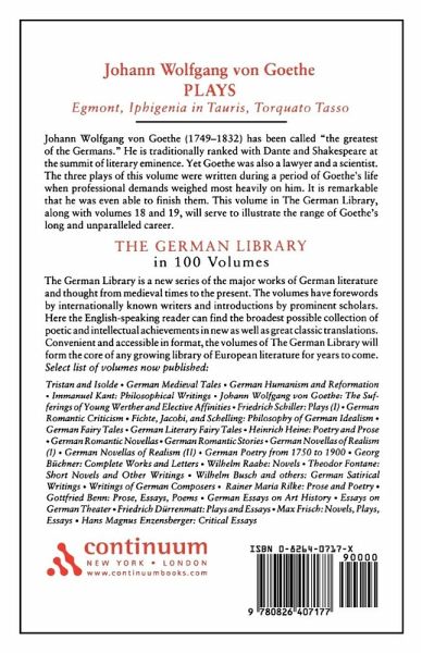 Johann Wolfgang von Goethe Plays Egmont, Iphigenia in Tauris, Torquato Tasso. This volume will serve to illustrate the range of Goethe's long and unparalleled career.