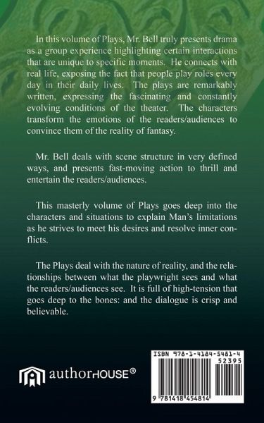 In this volume of Plays, Mr. Bell truly presents drama as a group experience highlighting certain interactions that are unique to specific moments. He connects with real life, exposing the fact that people play roles every day in their daily lives. The plays are remarkably written, expressing the fascinating and constantly evolving conditions of the theater. The characters transform the emotions of the readers/audiences to convince them of the reality of fantasy. Mr. Bell deals with scene structure in very defined ways, and presents fast-moving action to thrill and entertain the readers/audiences. This masterly volume of Plays goes deep into the characters and situations to explain Man's limitations as he strives to meet his desires and resolve inner conflicts. The Plays deal with the nature of reality, and the relationships between what the playwright sees and what the readers/audiences see. It is full of high-tension that goes deep to the bones: and the dialogue is crisp and believable.