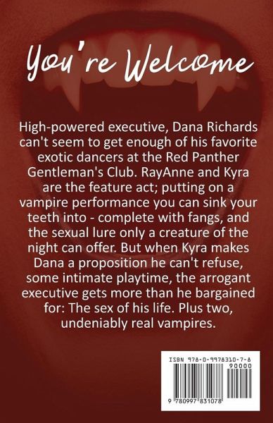 You're welcome... High-powered executive, Dana Richards can't seem to get enough of his favorite exotic dancers at the Red Panther Gentleman's Club. RayAnne and Kyra are the feature act; putting on a vampire performance you can sink your teeth into--complete with fangs, and the sexual lure only a creature of the night can offer. But when Kyra makes Dana a proposition he can't refuse, some intimate playtime, the arrogant executive gets more than he bargained for: The sex of his life. Plus two, undeniably real vampires.