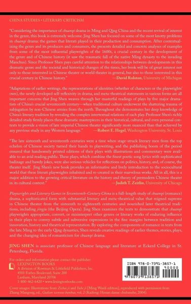 As the first full-length English language survey of China's rich and sophisticated chuanqi drama, Playwrights and Literary Games in Seventeenth-Century China offers detailed analyses of six canonical plays in the broad socio-historical context of late imperial China, supported by the application of both traditional and modern critical theories. Portraying the playwrights as creative readers of their cultural heritage, this study examines their plays as the products of their attachment to traditions and pursuit of novelty to surpass traditions.