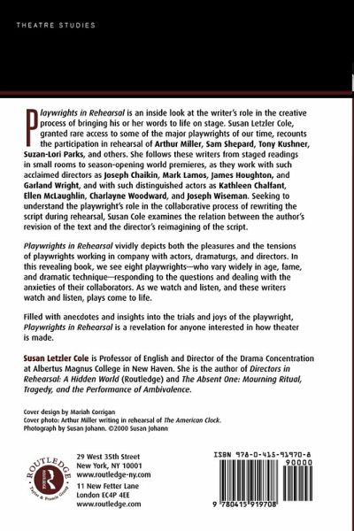 Playwrights in Rehearsal is an inside look at the writer's role in the creative process of bringing his or her words to life on stage. Susan Letzler Cole, granted rare access to some of the major playwrights of our time, recounts her participation in rehearsal with Arthur Miller, Sam Shepard, Tony Kushner and Suzan-Lori Parks, and others.