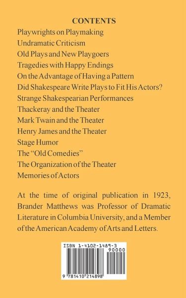 CONTENTS Playwrights on Playmaking Undramatic Criticism Old Plays and New Playgoers Tragedies with Happy Endings On the Advantage of Having a Pattern Did Shakespeare Write Plays to Fit His Actors? Strange Shakespearian Performances Thackeray and the Theater Mark Twain and the Theater Henry James and the Theater Stage Humor The "Old Comedies" The Organization of the Theater Memories of Actors At the time of original publication in 1923, Brander Matthews was Professor of Dramatic Literature in Columbia University, and a Member of the American Academy of Arts and Letters.