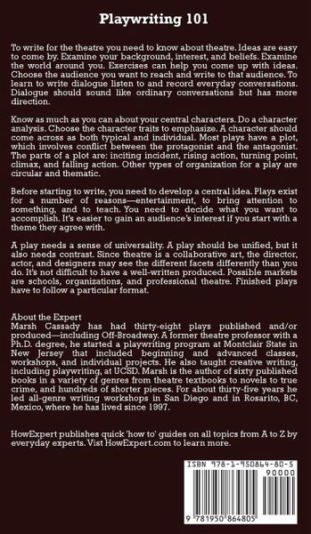 To write for the theatre you need to know about theatre. Ideas are easy to come by. Examine your background, interest, and beliefs. Examine the world around you. Exercises can help you come up with ideas. Choose the audience you want to reach and write to that audience. To learn to write dialogue listen to and record everyday conversations. Dialogue should sound like ordinary conversations but has more direction. Know as much as you can about your central characters. Do a character analysis. Choose the character traits to emphasize. A character should come across as both typical and individual. Most plays have a plot, which involves conflict between the protagonist and the antagonist. The parts of a plot are: inciting incident, rising action, turning point, climax, and falling action. Other types of organization for a play are circular and thematic. Before starting to write, you need to develop a central idea. Plays exist for a number of reasons—entertainment, to bring attention to something, and to teach. You need to decide what you want to accomplish. It’s easier to gain an audience’s interest if you start with a theme they agree with. A play needs a sense of universality. A play should be unified, but it also needs contrast. Since theatre is a collaborative art, the director, actor, and designers may see the different facets differently than you do. It’s not difficult to have a well-written produced. Possible markets are schools, organizations, and professional theatre. Finished plays have to follow a particular format. About the Expert Marsh Cassady has had thirty-eight plays published and/or produced—including Off-Broadway. A former theatre professor with a Ph.D. degree, he started a playwriting program at Montclair State in New Jersey that included beginning and advanced classes, workshops, and individual projects. He also taught creative writing, including playwriting, at UCSD. Marsh is the author of sixty published books in a variety of genres from theatre textbooks to novels to true crime, and hundreds of shorter pieces. For about thirty-five years he led all-genre writing workshops in San Diego and in Rosarito, BC, Mexico, where he has lived since 1997. HowExpert publishes quick 'how to' guides on all topics from A to Z by everyday experts.