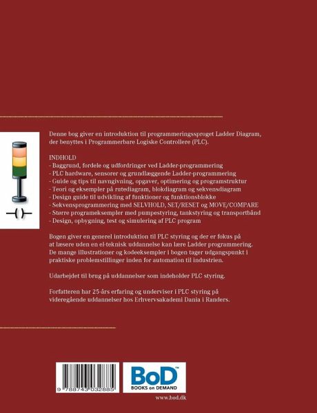 Denne bog giver en introduktion til programmeringssproget Ladder Diagram (LD), der benyttes i Programmerbare Logiske Controllere (PLC). Bogen giver en generel introduktion til PLC styring og der er fokus på at læsere uden en el-teknisk uddannelse kan lære Ladder programmering. De mange illustrationer og kodeeksempler i bogen tager udgangspunkt i praktiske problemstillinger inden for automation til industrien. INDHOLD - Baggrund, fordele og udfordringer ved Ladder-programmering - PLC hardware, sensorer og grundlæggende Ladder-programmering - Guide og tips til navngivning, opgaver, optimering og programstruktur - Teori og eksempler på rutediagram, blokdiagram og sekvensdiagram - Design guide til udvikling af funktioner og funktionsblokke - Programeksempler med opdeling i moduler, funktioner og funktionsblokke - Sekvensprogrammering med SELVHOLD, SET/RESET og MOVE/COMPARE - Større programeksempler med pumpestyring, tankstyring og transportbånd - Design, opbygning, test og simulering af PLC program Bogen er primært udarbejdet til brug på den 2-årige videregående fuldtidsuddannelse Automationsteknolog og deltidsuddannelsen Automation og Drift, hvor en stor del af studiet indeholder PLC styring. Men bogen er naturligvis også velegnet på de mange uddannelser der indeholder PLC styring. Her tænkes på uddannelserne til elektriker, styrings- og reguleringselektriker, automatiktekniker samt de videregående uddannelser til maskinmester og ingeniør. Forfatteren har 25-års erfaring og underviser i PLC styring på videregående uddannelser hos Erhvervsakademi Dania i Randers.
