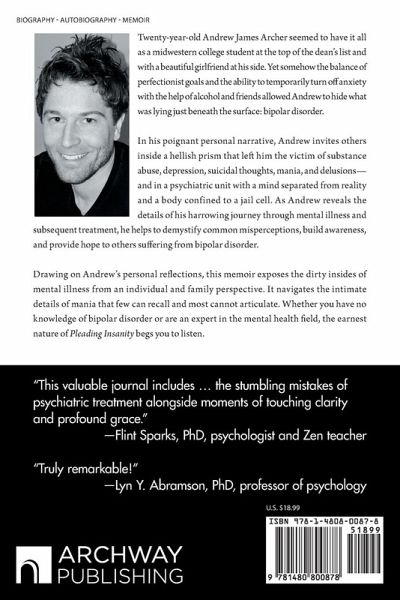 Twenty-year-old Andrew James Archer seemed to have it all as a midwestern college student at the top of the dean's list and with a beautiful girlfriend at his side. Yet somehow the balance of perfectionist goals and the ability to temporarily turn off anxiety with the help of alcohol and friends allowed Andrew to hide what was lying just beneath the surface: bipolar disorder. In his poignant personal narrative, Andrew invites others inside a hellish prism that left him the victim of substance abuse, depression, suicidal thoughts, mania, and delusions-and in a psychiatric unit with a mind separated from reality and a body confined to a jail cell. As Andrew reveals the details of his harrowing journey through mental illness and subsequent treatment, he helps to demystify common misperceptions, build awareness, and provide hope to others suffering from bipolar disorder. Drawing on Andrew's personal reflections, this memoir exposes the dirty insides of mental illness from an individual and family perspective. It navigates the intimate details of mania that few can recall and most cannot articulate. Whether you have no knowledge of bipolar disorder or are an expert in the mental health field, the earnest nature of Pleading Insanity begs you to listen. "This valuable journal includes ... the stumbling mistakes of psychiatric treatment alongside moments of touching clarity and profound grace." -Flint Sparks, PhD, psychologist and Zen teacher "Truly remarkable!" -Lyn Y. Abramson, PhD, professor of psychology