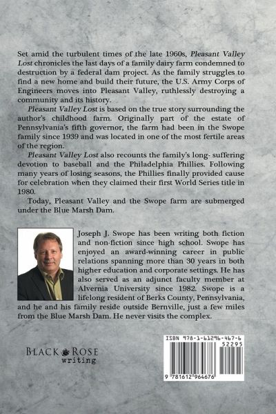 John E. Weaver Excellent Reads Book Award for Historical Non-Fiction 2017 Maxy Awards Winner 2016 - Best Nonfiction Set amid the turbulent times of the late 1960s, Pleasant Valley Lost chronicles the last days of a family dairy farm condemned to destruction by a federal dam project. As the family struggles to find a new home and build their future, the U.S. Army Corps of Engineers moves into Pleasant Valley, ruthlessly destroying a community and its history. Pleasant Valley Lost is based on the true story surrounding the author's childhood farm. Originally part of the estate of Pennsylvania's fifth governor, the farm had been in the Swope family since 1939 and was located in one of the most fertile areas of the region. Pleasant Valley Lost also recounts the family's long-suffering devotion to baseball and the Philadelphia Phillies. Following many years of losing seasons, the Phillies finally provided cause for celebration when they claimed their first World Series title in 1980. Today, Pleasant Valley and the Swope farm are submerged under the Blue Marsh Dam.