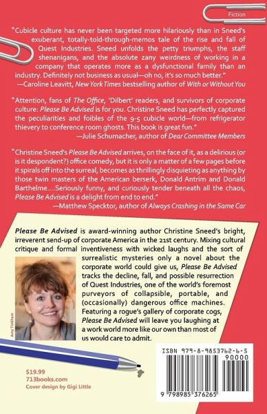 Please Be Advised is award-winning author Christine Sneed's bright, irreverent send-up of corporate America in the 21st century. Mixing cultural critique and formal inventiveness with wicked laughs and the sort of surrealistic mysteries only a novel about the corporate world could give us, Please Be Advised tracks the decline, fall, and possible resurrection of Quest Industries, one of the world's foremost purveyors of collapsible, portable, and (occasionally) dangerous office machines. Featuring a rogue's gallery of corporate cogs from drunk, womanizing, and often-delusional CEO Bryan Stokerly, Esq. to his executive secretary, the brainy, libidinous Hannah Louise Schmidt and his soon-to-be-rival, new office manager and disgraced former coroner, Dr. Ken Crickshaw, Jr., Please Be Advised will leave you laughing at a work world more like our own than most of us would care to admit.