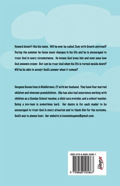Howard doesn't like his name. Will he ever be called Joey with Gram's approval? During the summer he faces many changes in his life and he is encouraged to trust God in every circumstance. He knows God loves him and even sees how God answers prayer. But can he trust God when his life is turned upside down? Will he be able to accept God's answer when it comes? Imogene Boone lives in Middletown, CT with her husband. They have four married children and nineteen grandchildren. She has also had experience working with children as a Sunday School teacher, a child care provider, and a school teacher. Being a pre-teen is sometimes hard. Her desire is for each reader to be encouraged to trust God in every situation and to thank Him for the outcome. God's way is always best. Her website is booneimogene@gmail.com.