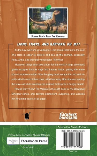 It's the day everyone is waiting for: The annual field trip to the zoo! The class is eager to explore and see all the animals, especially Andy, Anna, and their pet velociraptor, Tennyson. However, things soon take a turn for the worst! A large silverback gorilla escapes from its cage and causes havoc, putting the entire zoo on lockdown mode! Now the gang must escape the zoo and reunite with the rest of their class, with their trusty little dinosaur leading the way-all while avoiding zoo animals looking for a hungry snack! Please Don't Feed The Raptors is the sixth book in The Backpack Dinosaur series, and delivers excitement, suspense, and Jurassic fun for animal-lovers of all ages!
