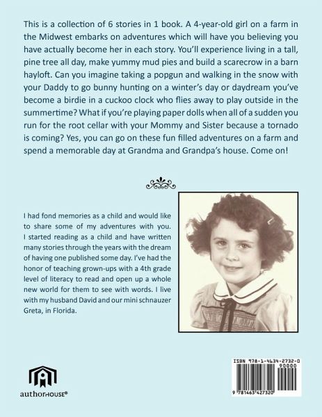 This is a collection of 6 stories in 1 book. A 4-year-old girl on a farm in the Midwest embarks on adventures which will have you believing you have actually become her in each story. You'll experience living in a tall, pine tree all day, make yummy mud pies and build a scarecrow in a barn hayloft. Can you imagine taking a popgun and walking in the snow with you Daddy to go bunny hunting on a winter's day or daydream with paper dolls when all of a sudden you run for the root cellar with your Mommy and Sister because a tornado is coming? Yes, you can go on these fun filled adventures on a farm and spend a memorable day at Grandma and Grandpa's house. Come on!