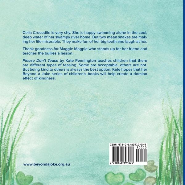 Celia Crocodile is very shy. She is happy swimming alone in the cool, deep water of her swampy river home. But two mean snakes are making her life miserable. They make fun of her big teeth and laugh at her. Thank goodness for Maggie Magpie who stands up for her friend and teaches the bullies a lesson. Please Don't Tease by Kate Pennington teaches children that there are different types of teasing. Some are acceptable, others are not. But being kind to others is always the best option. Kate hopes that her Beyond a Joke series of children's books will help create a domino effect of kindness.