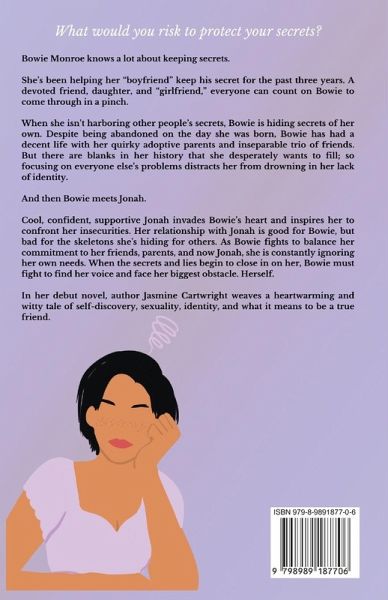 What would you risk to protect your secrets? Bowie Monroe knows a lot about keeping secrets. She's been helping her "boyfriend" keep his secret for the past three years. A devoted friend, daughter, and "girlfriend," everyone can count on Bowie to come through in a pinch. When she isn't harboring other people's secrets, Bowie is hiding secrets of her own. Despite being abandoned on the day she was born, Bowie has had a decent life with her quirky adoptive parents and inseparable trio of friends. But there are blanks in her history that she desperately wants to fill; so focusing on everyone else's problems distracts her from drowning in her lack of identity. And then Bowie meets Jonah. Cool, confident, supportive Jonah invades Bowie's heart and inspires her to confront her insecurities. Her relationship with Jonah is good for Bowie, but bad for the skeletons she's hiding for others. As Bowie fights to balance her commitment to her friends, parents, and now Jonah, she is constantly ignoring her own needs. When the secrets and lies begin to close in on her, Bowie must fight to find her voice and face her biggest obstacle. Herself. In her debut novel, author Jasmine Cartwright weaves a heartwarming and witty tale of self-discovery, sexuality, identity, and what it means to be a true friend.