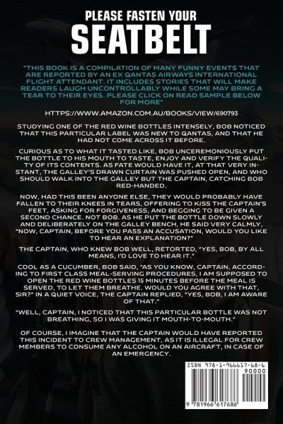 This book is a compilation of many funny events that are reported by an ex Qantas Airways International Flight Attendant. It includes stories that will make readers laugh uncontrollably while some may bring a tear to their eyes. Here's a small sample. Studying one of the Red wine bottles intensely, Bob noticed that this particular Label was new to Qantas, and that he had not come across it before. Curious as to what it tasted like, Bob unceremoniously put the bottle to his mouth to taste, enjoy and verify the quality of its contents. As fate would have it, at that very instant, the galley's drawn curtain was pushed open, and who should walk into the galley but the Captain, catching Bob red-handed. Now, had this been anyone else, they would probably have fallen to their knees in tears, offering to kiss the Captain's feet, asking for forgiveness, and begging to be given a second chance. Not Bob. As he put the bottle down slowly and deliberately on the Galley bench, he said very calmly, "Now, Captain, before you pass an accusation, would you like to hear an explanation?" The Captain, who knew Bob well, retorted, "Yes, Bob, by all means, I'd love to hear it." Cool as a cucumber, Bob said, "As you know, Captain, according to First Class meal-serving procedures, I am supposed to open the Red wine bottles 15 minutes before the meal is served, to let them breathe. Would you agree with that, Sir?" In a quiet voice, the Captain replied, "Yes, Bob, I am aware of that." "Well, Captain, I noticed that this particular bottle was not breathing, so I was giving it mouth-to-mouth." Of course, I imagine that the Captain would have reported this incident to Crew management, as it is illegal for Crew Members to consume any alcohol on an aircraft, in case of an Emergency.