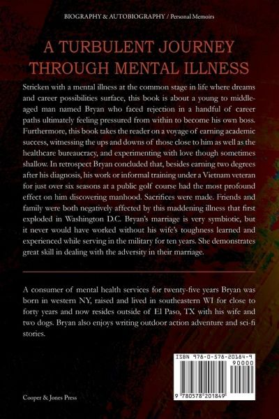 Stricken with a mental illness at the common stage in life where dreams and career possibilities surface, this book is about a young to middle-aged man named Bryan that faced rejection in a handful of career paths ultimately feeling pressured from within to become his own boss. This book takes the reader on a voyage of earning academic success, witnessing the ups and downs of those close to him as well as the healthcare bureaucracy, and experimenting with love though sometimes shallow. In retrospect Bryan concluded that, besides earning two degrees after his diagnosis, his work or informal training under a Vietnam veteran for just over six seasons at a public golf course had the most profound effect on him discovering manhood. Sacrifices were made. Friends and family were both negatively affected by this maddening illness that first exploded in Washington D.C. Bryan's marriage is very symbiotic, but it never would have worked without his wife's toughness learned and experienced while serving in the military for ten years. She demonstrates great skill in dealing with the adversity in their marriage.