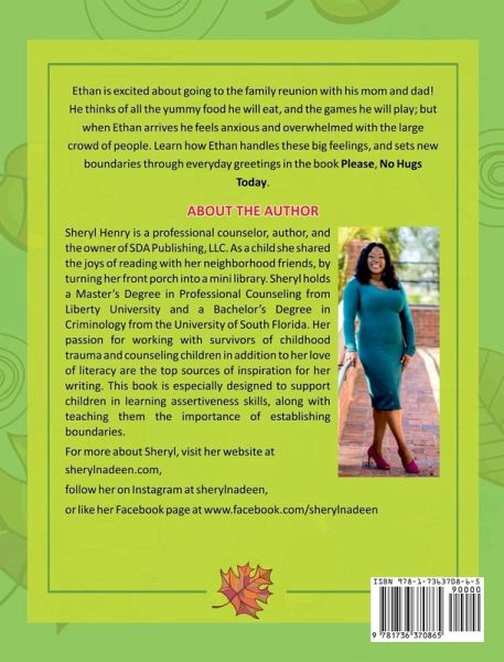 Have you been looking for a book that helps children establish healthy boundaries for their bodies? It can be a daunting task! Please No Hugs Today helps parents, educators, and therapists ease into the discussion of bodily autonomy and consent by teaching the concepts using everyday greetings. The main character, 5-year-old Ethan is a happy kid who loves hanging out with his family! He is excited when he is told by his mom and dad that he will get to go to the family reunion. Ethan is eager to meet new cousins and see his aunts and uncles, but when he arrives he feels overwhelmed by the big crowd. Most days Ethan loves to give hugs, but he just doesn't feel like hugging today. When his aunt gestures to give him a hug, Ethan withdraws and needs some help navigating his big emotions. This beautifully written picture book teaches young children to establish boundaries through everyday greetings by highlighting that everybody gets to choose how they would like to say hello. This book is especially designed to support essential social and emotional learning skills such as polite greetings, handling uncomfortable emotions, and open communication of feelings to parents and caregivers. Exercises to further the conversation can be found in the back of the book.