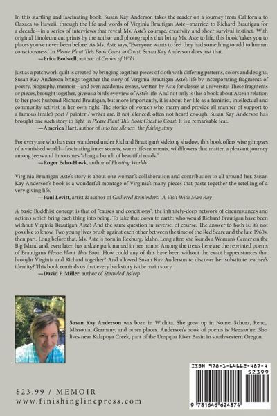 This book is the result of my meeting Virginia Brautigan Aste and sitting down and interviewing her over the course of six years. Our conversations continued as we built a friendship at our teaching jobs at a small school in Pahoa, Hawaii and by meeting for breakfast at the local cafe. What is in this book are essays, photographs, and Virginia's story. Her narrative highlights her years growing up in California and then her adventures before, during, and after being married to Richard Brautigan. Widowhood did not stop her from pursuing her own dreams and direction and we see how her survival became her life path in ways which added to the lives of others. I met Virginia in 2008 when I changed high schools and began teaching at Pahoa High, after five years at Keaau High, on Hawaii's Big Island. She was a substitute teacher at the school and I asked her to be my sub/got into a conversation with her and she loaned me her copy of her daughter, Ianthe's, book, You Can't Catch Death. She said she noticed that I had "some good books" in my classroom (they were donations I got from a free box at my last job--from New Directions). She also said that she had been married to Richard Brautigan. I was so shocked, I didn't believe her--that's why she loaned me her daughter's book and of course I was instantly humbled and ashamed that I was skeptical about what she said. (Pahoa is very rural, isolated, and poor). I asked her if I could interview her about Richard Brautigan. She agreed and after these interviews were finished (published in Arthur magazine online https://arthurmag.com/2009/12/25/virginia-aste/ and also in Beat Scene #62, 2010, "Oaxaca") I thought that her story was interesting and[SKA1] also another way to understand/appreciate his writing, so I continued the project of interviewing her and then writing up my notes and recordings. I read his books growing up and also heard him read from Tokyo Montana Express in Eugene when I was starting my undergrad studies there. We had lived in Missoula, Montana and Polson, Montana. Eugene was our second home, too, because of weekends spent at an artsy café building called Fifth Street Market. This became Please Plant This Book Coast To Coast. It contains photographs, linoleum cut prints I made, Virginia's narrative, my essays, and samples of Virginia's research papers she wrote in college when she returned to study at age 50. I taught in Pahoa until 2015 when we moved back to the mainland, to Eugene, Oregon. Virginia was my main substitute teacher and we stayed with her when we evacuated due to a hurricane in 2014--followed two weeks later by lava encroachment into town--so we missed the huge eruption in 2018 which overran our old neighborhood. I now live in Sutherlin and care for my parents. Virginia and I presented sections of Please Plant This Book Coast To Coast at the Oregon Poetry Society's Fall 2019 conference in Salem, Oregon. --Susan Kay Anderson