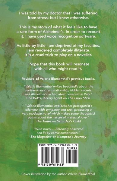 I was told by my doctor that I was suffering from stress; but I knew otherwise. This is my story of what it feels like to have a rare form of Alzheimer's. In order to recount it, I have used voice recognition software. As little by little I am deprived of my faculties, I am rendered completely illiterate. It is a cruel trick to play on a novelist. I hope that this book will resonate with all who might read it. Reviews of Valerie Blumenthal's previous books. "Valerie Blumenthal writes beautifully about the mother/daughter relationship, hidden secrets and Alzheimer's in her latest novel set in Italy." Tina Betts, literary agent on The Lupo Stick "Valerie Blumenthal explores her protagonist's dilemma with sympathy and tact, producing a very readable novel which makes some thoughtful points about the nature of maternal love." The Times on Saturday's Child " wise novel ... Shrewdly observed and lit by comic compassion." She Magazine on Kempton's Journey