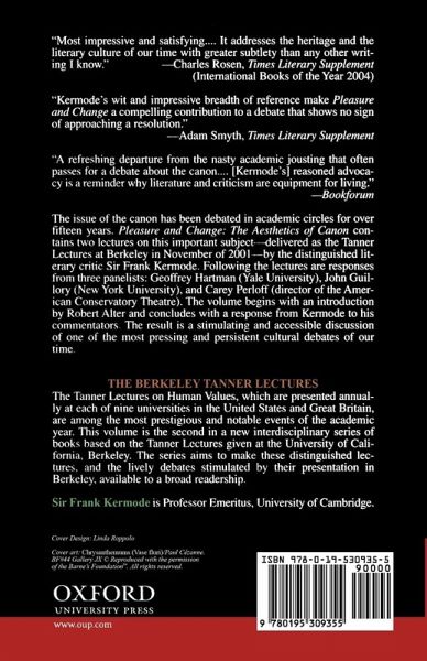 The question of the canon has been the subject of debate in academic circles for over fifteen years. Pleasure and Change contains two lectures on this important subject by the distinguished literary critic Sir Frank Kermode. In essays that were originally delivered as Tanner Lectures at Berkeley in November of 2001, Kermode reinterprets the question of canon formation in light of two related and central notions: pleasure and change. He asks how aesthetic pleasure informs what we find valuable, and how this perception changes over time. Kermode also explores the role of chance, observing the connections between canon formation and unintentional and sometimes even random circumstance. Geoffrey Hartmann (Yale University), John Guillory (New York University), and Carey Perloff (director of the American Conservatory Theatre) offer incisive comments on these essays, to which Kermode responds in a lively rejoinder. The volume begins with a helpful introduction by Robert Alter. The result is a stimulating and accessible discussion of a highly significant cultural debate.