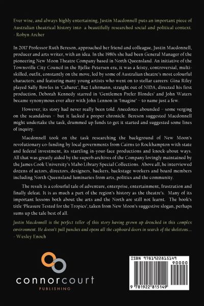 Ever wise, and always highly entertaining, Justin Macdonnell puts an important piece of Australian theatrical history into a beautifully researched social and political context. - Robyn Archer In 2017 Professor Ruth Bereson approached her friend and colleague, Justin Macdonnell, producer and arts writer, with an idea. In the 1980s she had been General Manager of the pioneering New Moon Theatre Company based in North Queensland. An initiative of the Townsville City Council in the Bjelke-Petersen era, it was a feisty, controversial, multi-skilled, outfit, constantly on the move, led by some of Australian theatre's most colourful characters; and featuring many young artists who went on to stellar careers: Gina Riley played Sally Bowles in 'Cabaret', Baz Luhrmann, straight out of NIDA, directed his first production, Deborah Kennedy starred in 'Gentlemen Prefer Blondes' and John Waters became synonymous ever after with John Lennon in 'Imagine' - to name just a few. However, its story had never really been told. Anecdotes abounded - some verging on the scandalous - but it lacked a proper chronicle. Bereson suggested Macdonnell might undertake the task, drummed up funds to get it started and suggested some lines of inquiry. Macdonnell took on the task researching the background of New Moon's revolutionary co-funding by local governments from Cairns to Rockhampton with state and federal investment, its startling in-your-face productions and knock-about ways. All that was greatly aided by the superb archives of the Company lovingly maintained by the James Cook University's Mabo Library Special Collections. Above all, he interviewed dozens of actors, directors, designers, backers, backstage workers and board members including North Queensland luminaries from arts, politics and the community. The result is a colourful tale of adventure, enterprise, entertainment, frustration and finally defeat. It is as much a part of the region's history as the theatre's. Many of its important lessons both about the arts and the North are still not learnt. The book's title 'Pleasure Tested for the Tropics', taken from New Moon's suggestive slogan, perhaps sums up the tale best of all. Justin Macdonnell is the perfect teller of this story having grown up drenched in this complex environment. He doesn't pull punches and opens all the cupboard doors in search of the skeletons... - Wesley Enoch