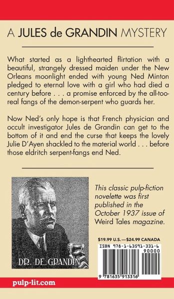 What started as a lighthearted flirtation with a beautiful, strangely dressed maiden under the New Orleans moonlight ended with young Ned Minton pledged to eternal love with a girl who had died a century before -- a promise enforced by the all-too-real fangs of the demon-serpent who guarded her. Ned's only hope is that French physician and occult investigator Jules de Grandin can get to the bottom of it and end the curse that keeps the lovely Julie d'Ayen shackled to the material world -- before the eldritch serpent's fangs end Ned.