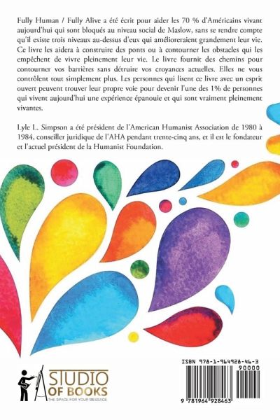 Fully Human / Fully Alive a été écrit pour aider les 70 % d'Américains vivant aujourd'hui qui sont bloqués au niveau social de Maslow, sans se rendre compte qu'il existe trois niveaux au-dessus d'eux qui amélioreraient grandement leur vie. Ce livre les aidera à construire des ponts ou à contourner les obstacles qui les empêchent de vivre pleinement leur vie. Le livre fournit des chemins pour contourner vos barrières sans détruire vos croyances actuelles. Elles ne vous contrôlent tout simplement plus. Les personnes qui lisent ce livre avec un esprit ouvert peuvent trouver leur propre voie pour devenir l'une des 1% de personnes qui vivent aujourd'hui une expérience épanouie et qui sont vraiment pleinement vivantes. Lyle L. Simpson a été président de l'American Humanist Association de 1980 à 1984, conseiller juridique de l'AHA pendant trente-cinq ans, et il est le fondateur et l'actuel président de la Humanist Foundation.