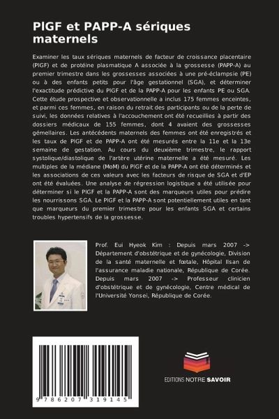 Examiner les taux sériques maternels de facteur de croissance placentaire (PlGF) et de protéine plasmatique A associée à la grossesse (PAPP-A) au premier trimestre dans les grossesses associées à une pré-éclampsie (PE) ou à des enfants petits pour l'âge gestationnel (SGA), et déterminer l'exactitude prédictive du PlGF et de la PAPP-A pour les enfants PE ou SGA. Cette étude prospective et observationnelle a inclus 175 femmes enceintes, et parmi ces femmes, en raison du retrait des participants ou de la perte de suivi, les données relatives à l'accouchement ont été recueillies à partir des dossiers médicaux de 155 femmes, dont 4 avaient des grossesses gémellaires. Les antécédents maternels des femmes ont été enregistrés et les taux de PlGF et de PAPP-A ont été mesurés entre la 11e et la 13e semaine de gestation. Au cours du deuxième trimestre, le rapport systolique/diastolique de l'artère utérine maternelle a été mesuré. Les multiples de la médiane (MoM) du PlGF et de la PAPP-A ont été déterminés et les associations de ces valeurs avec les facteurs de risque de SGA et d'EP ont été évaluées. Une analyse de régression logistique a été utilisée pour déterminer si le PlGF et la PAPP-A sont des marqueurs utiles pour prédire les nourrissons SGA. Le PlGF et la PAPP-A sont potentiellement utiles en tant que marqueurs du premier trimestre pour les enfants SGA et certains troubles hypertensifs de la grossesse.