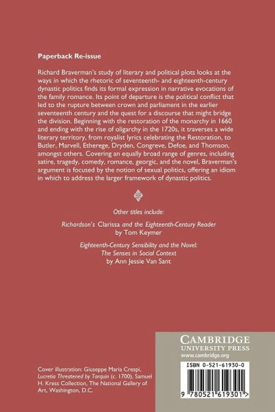 Richard Braverman's study of literary and political plots looks at the ways in which the rhetoric of seventeenth- and eighteenth-century dynastic politics finds its formal expression in narrative evocations of the family romance. Its point of departure is the political conflict that led to the rupture between crown and parliament in the earlier seventeenth century, and the ensuing quest for a discourse that might bridge the division. Beginning with the restoration of the monarchy in 1660 and ending with the rise of oligarchy in the 1720s, it traverses a wide literary territory, from royalist lyrics celebrating the Restoration, to Butler, Marvell, Etherege, Dryden, Congreve, Defoe and Thomson, amongst others. Covering an equally broad range of genres, including satire, tragedy, comedy, romance, georgic and the novel, Braverman's argument is focused by the notion of sexual politics, offering an idiom in which to address the larger framework of dynastic politics.