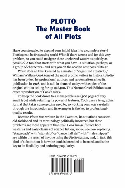 Have you struggled to expand your initial idea into a complete story? Plotting can be frustrating work! What if there were a tool for this very problem, so you could navigate these uncharted waters as quickly as possible? A tool that starts with what you have (a situation, perhaps, or a group of characters) and sets you on the road to new possibilities? Plotto does all this. Created by a master of "organized creativity," William Wallace Cook (one of the most prolific writers in history), Plotto has been prized by professional authors and screenwriters since its publication in 1928, and is still in demand today, with copies of the original edition selling for up to $400. This Norton Creek Edition is an exact reproduction of Cook’s work. To keep the book down to a manageable size (300 pages of very small type) while retaining its powerful features, Cook uses a telegraphic format that takes some getting used to. To get up to speed quickly, get Plotto's companion volume, the Plotto Instruction Booklet. This is the key to avoiding false starts and getting professional-quality results quickly. What is Plotto? Let's start by what it is not: it's not a random plot generator. There is no randomness in Plotto. Instead, Plotto is a well-indexed catalog of character situations, especially character conflicts. Each conflict has suggestions for both backstory and future developments. Plotto also has multiple indexes. For example, you can enter through the combination of characters in the conflict (such as the male protagonist and the female protagonist), the situation (needing money to get out of a scrape), or starting at the end and working backwards (becoming involved in the weird and occult and coming to a tragic end). Thus, Plotto is equally useful for plots, subplots, and backstory. Because Plotto was written in the Twenties, its situations can seem old-fashioned and its terminology politically incorrect. These problems are more apparent than real. Cook himself wrote both westerns and early classics of science fiction, so you see how replacing "stagecoach" with "star ship" or "dance hall girl" with "male stripper" are within the reach of anyone using the Plotto system. In fact, this kind of substitution is an ordinary and expected part of the Plotto system, and is essential to the fruitful use of the Plotto system, and is the key to its flexibility and enduring popularity. This Norton Creek Press edition of Plotto is an exact replica of the original edition. Visit our Web site at http://www.nortoncreekpress.com for more classic reprints, including William Wallace Cook's Plotto Instruction Booklet and his autobiographical The Fiction Factory.