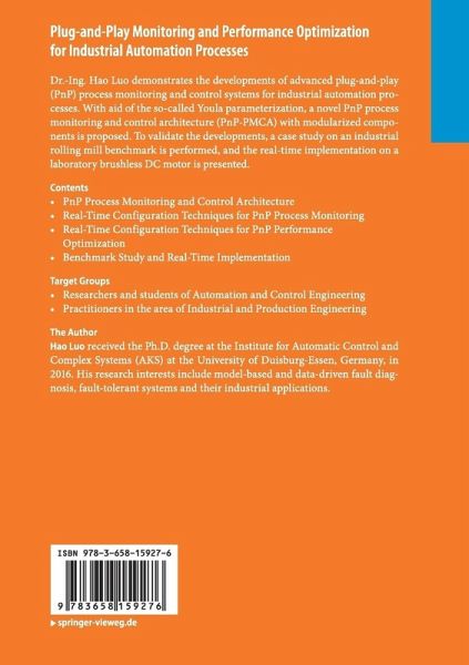 Dr.-Ing. Hao Luo demonstrates the developments of advanced plug-and-play (PnP) process monitoring and control systems for industrial automation processes. With aid of the so-called Youla parameterization, a novel PnP process monitoring and control architecture (PnP-PMCA) with modularized components is proposed. To validate the developments, a case study on an industrial rolling mill benchmark is performed, and the real-time implementation on a laboratory brushless DC motor is presented.