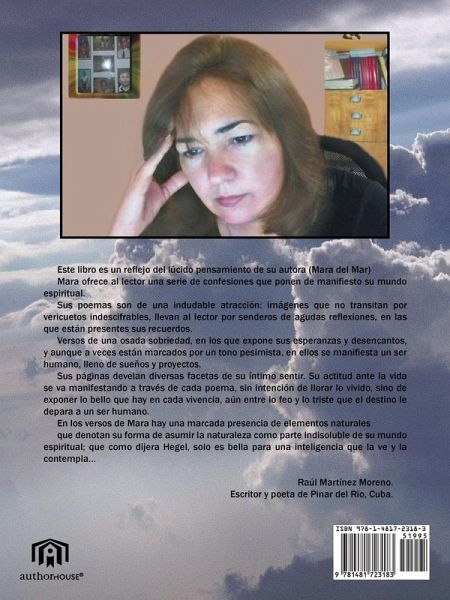 Este libro es un reflejo del lúcido pensamiento de su autora (Mara del Mar) Mara ofrece al lector una serie de confesiones que ponen de manifiesto su mundo espiritual. Sus poemas son de una indudable atracción: imágenes que no transitan por vericuetos indescifrables, llevan al lector por senderos de agudas reflexiones, en las que están presentes sus recuerdos. Versos de una osada sobriedad, en los que expone sus esperanzas y desencantos, y aunque a veces están marcados por un tono pesimista, en ellos se manifiesta un ser humano, lleno de sueños y proyectos. Sus páginas develan diversas facetas de su íntimo sentir. Su actitud ante la vida se va manifestando a través de cada poema, sin intención de llorar lo vivido, sino de exponer lo bello que hay en cada vivencia, aún entre lo feo y lo triste que el destino le depara a un ser humano. En los versos de Mara hay una marcada presencia de elementos naturales que denotan su forma de asumir la naturaleza como parte indisoluble de su mundo espiritual; que como dijera Hegel, solo es bella para una inteligencia que la ve y la contempla... Raúl Martínez Moreno. Escritor y poeta de Pinar del Rio, Cuba.