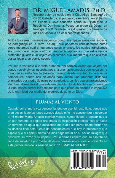 Cuando por primera vez concebí la idea de escribir este libro, pensé que eran cosas ilusorias, pues aunque desde niño me acostumbré a observar a mi madre María Amadis escribir versos, nunca llegué a pensar que a un ser humano le llegara una musa de inspiración poética, cual si fuese un torrente de agua que desciende de lo alto sin parar, hasta formar en su destino fi nal esta fuente de pensamientos que hoy le presento y que espero que el Espíritu Santo de Dios haga brotar en su ser un milagro que despierte su razón y su espíritu. Por lo demás espero que su espíritu se llene de sabiduría por medio de estos pensamientos, que le presento en este primer libro de la serie titulada: "PLUMAS AL VIENTO".