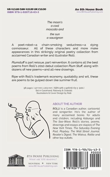 The moon's a cool moscato and the sun a sauvignon A poet-robot-a chain-smoking seductress-a dying connoisseur. All of these characters and more make appearances in this strikingly original poetry collection from acclaimed Canadian writer and illustrator Rolli. "Plumstuff" is part reissue, part reinvention. It contains all the best poems from Rolli's 2010 debut collection "Plum Stuff", along with dozens of new poems-and all-new drawings. Ripe with Rolli's trademark economy, quotabilty and wit, these are poems to be gulped down like summer fruit.