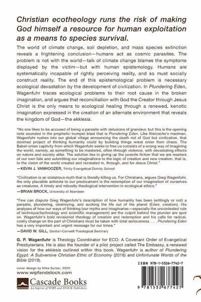 Christian ecotheology runs the risk of making God himself a resource for human exploitation as a means to species survival. The world of climate change, soil depletion, and mass species extinction reveals a frightening conclusion--humans act as cosmic parasites. The problem is not with the world--talk of climate change blames the symptoms displayed by the victim--but with human epistemology. Humans are systematically incapable of rightly perceiving reality, and so must socially construct reality. The end of this epistemological problem is necessary ecological devastation by the development of civilization. In Plundering Eden, Wagenfuhr traces ecological problems to their root cause in the broken imagination, and argues that reconciliation with God the Creator through Jesus Christ is the only means to ecological healing through a renewed, kenotic imagination expressed in the creation of an alternate environment that reveals the kingdom of God--the ekklesia.