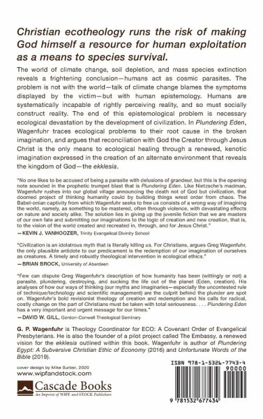 Christian ecotheology runs the risk of making God himself a resource for human exploitation as a means to species survival. The world of climate change, soil depletion, and mass species extinction reveals a frightening conclusion--humans act as cosmic parasites. The problem is not with the world--talk of climate change blames the symptoms displayed by the victim--but with human epistemology. Humans are systematically incapable of rightly perceiving reality, and so must socially construct reality. The end of this epistemological problem is necessary ecological devastation by the development of civilization. In Plundering Eden, Wagenfuhr traces ecological problems to their root cause in the broken imagination, and argues that reconciliation with God the Creator through Jesus Christ is the only means to ecological healing through a renewed, kenotic imagination expressed in the creation of an alternate environment that reveals the kingdom of God--the ekklesia.